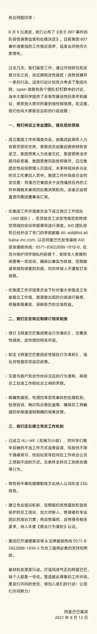 8月12日,阿里巴巴在官方微信公众号发布文章《我们的反思与行动》,称“最好的反思是行动“,并在阿里内网公布了推动反性骚扰的机制化工作进展,包括设立专业团队、制定和修订相关制度、建立常态工作机制。
