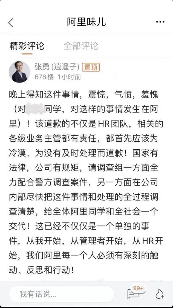 针对此事件,阿里巴巴董事局主席兼CEO张勇8月8日凌晨在阿里内网发帖,用震惊、气愤、羞愧,表达对于此事的感受。他同时表示,必须调查清楚,给全体阿里同学和全社会一个交代。