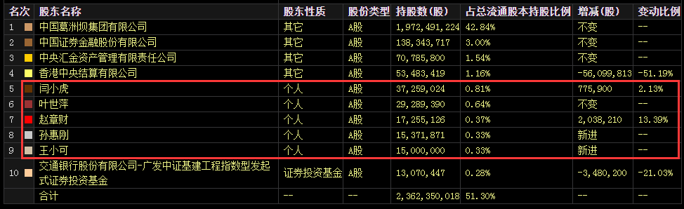 在上述几人中,持股最多的是闫小虎,持有3725万股,按照葛洲坝最后一个交易日9.93元的收盘价计算,其个人的持仓市值就达到了3.69亿元。