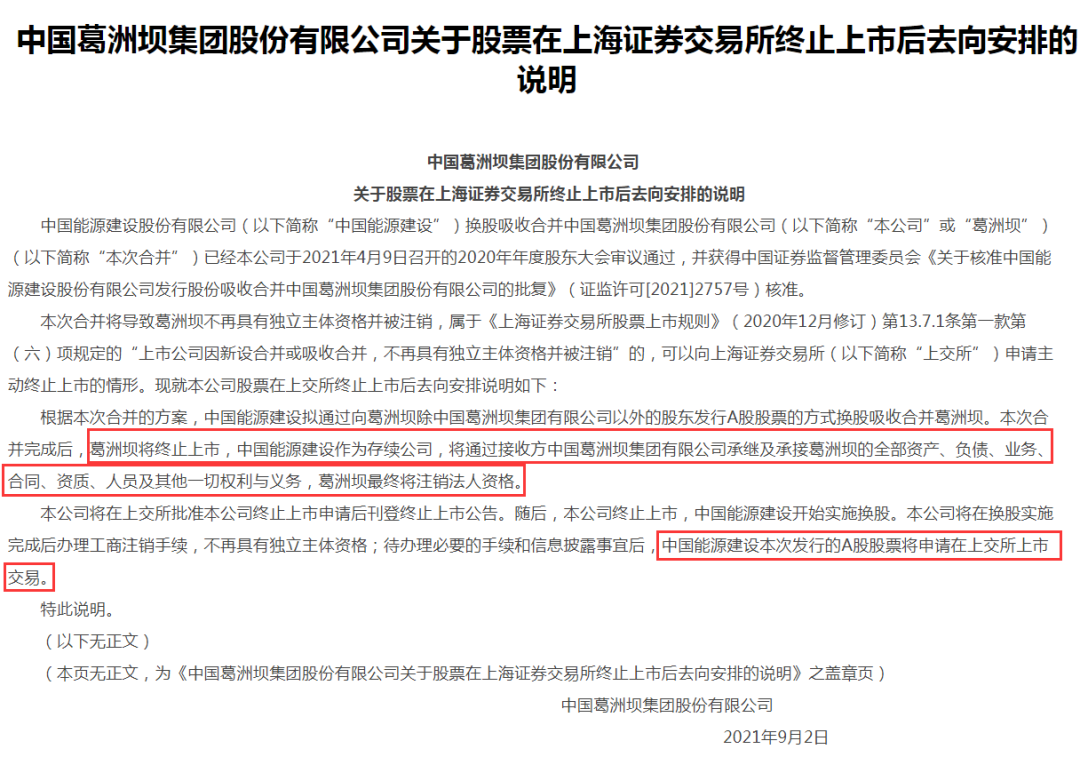 9月2日的公告显示,本次合并完成后,葛洲坝将终止上市,中国能源建设作为存续公司,将通过接收方中国葛洲坝集团有限公司承继及承接葛洲坝的全部资产、负债、业务、合同、资质、人员及其他一切权利与义务,葛洲坝最终将注销法人资格。同时,待办理必要的手续和信息披露事宜后,中国能源建设本次发行的A股股票将申请在上交所上市交易。