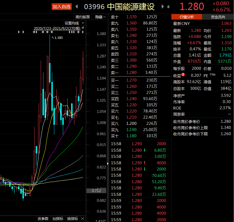 而港股的中国能源建设也在近期出现暴涨,现在市值为384亿港元,约合人民币319亿元。