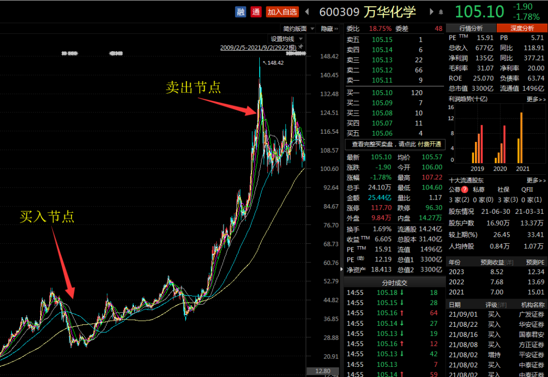 在2018年中报到2019年中报期间,万华化学股价基本维持在40元附近波动,因此可把孙惠刚的持股成本粗略估算为40元左右;随后从2019年中报后,万华化学的股价就一路走高,到2021年一季度时,其股价达到阶段高点,股价在110元至140元之间。