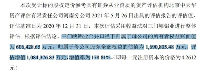 明泰铝业公告显示,以2020年12月31日为评估基准日,中介机构采用收益法对三门峡铝业进行整体评估。根据评估结论,三门峡铝业合并口径下归属于母公司的所有者权益账面值为60.64亿元,归属于母公司股东全部权益的估值为169亿元,评估增值率为178.81%(即每1元注册资本的价格为4.2612元)。最终,由转让各方共同协商定价,确定受让每1元注册资本的价格为4.0324元。