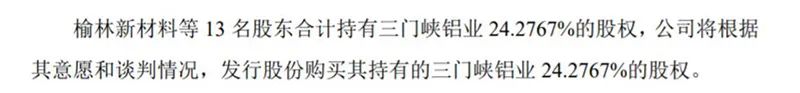 天眼查显示,三门峡铝业在今年8月有过一轮股权变更,增加了甘肃东兴铝业等多名股东,明泰铝业受让的股权尚未完成工商变更。据福达合金的公告,榆林新材料等13名股东合计持有三门峡铝业 24.2767%的股权,公司将根据其意愿和谈判情况,发行股份购买其持有的三门峡铝业的股权。