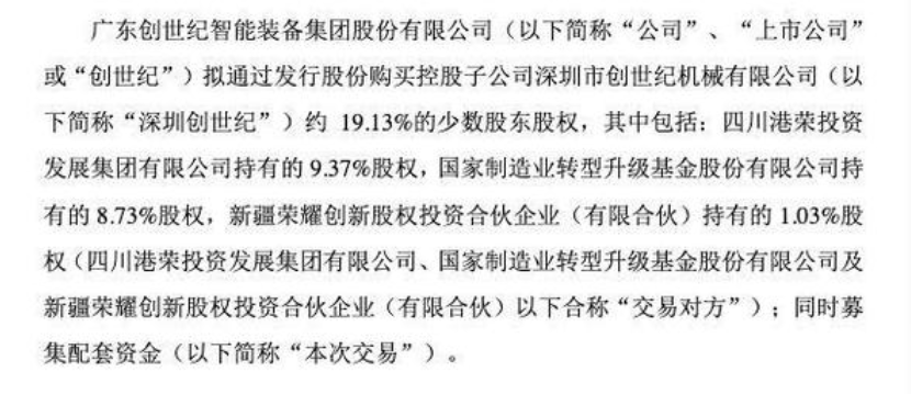 10月10日晚,创世纪发布公告,披露重大资产重组方案,公司拟以发行股份方式购买港荣集团、国家制造业基金和荣耀创投持有的公司控股子公司深圳创世纪19.13%的少数股东股权。此次交易完成后,公司持有深圳创世纪股权将升至98.12%。公司股票11日复牌。