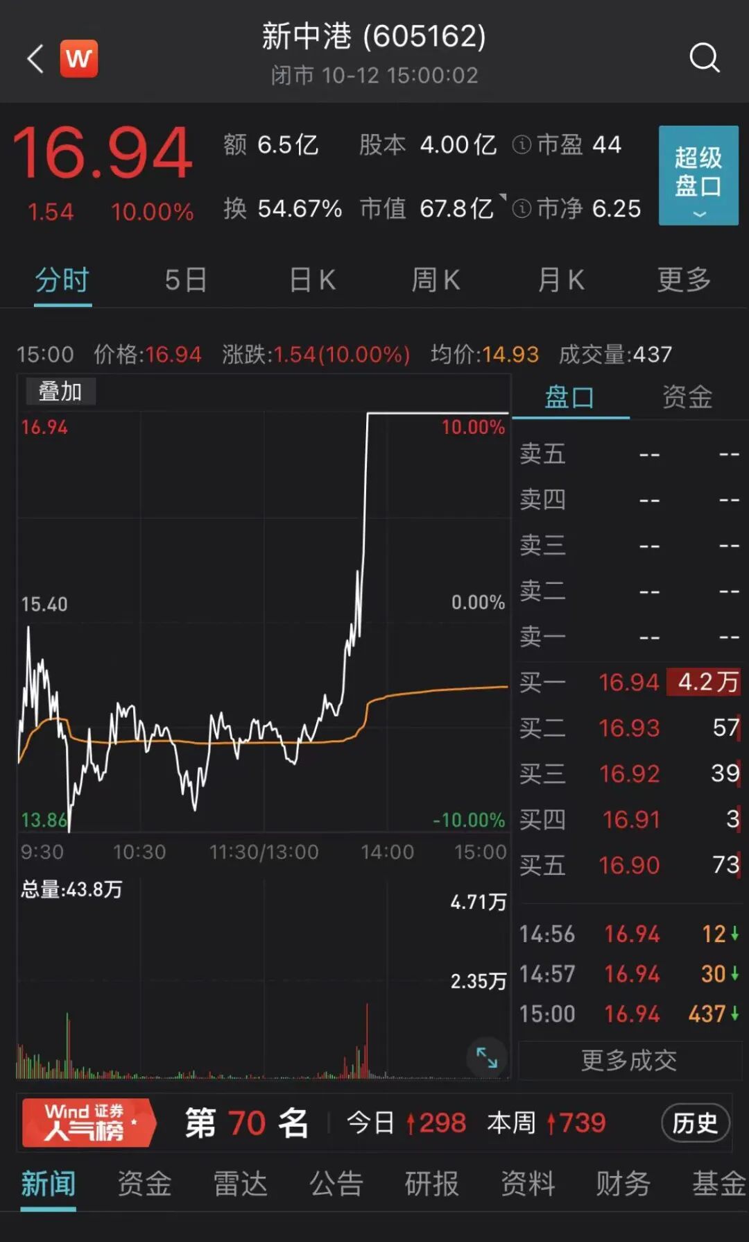 弱市出妖股。今天上午新中港触及跌停价,但后来上演地天板,成交额超6亿元,迎来四连板。