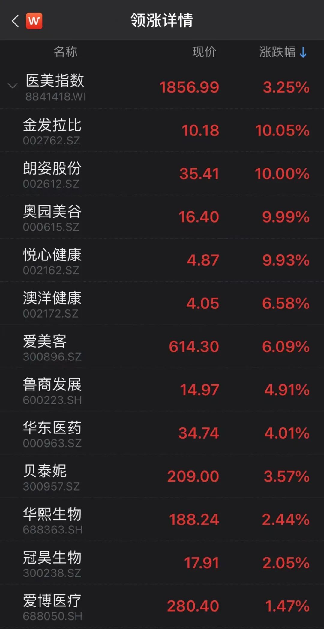 今日部分涨幅居前医美股