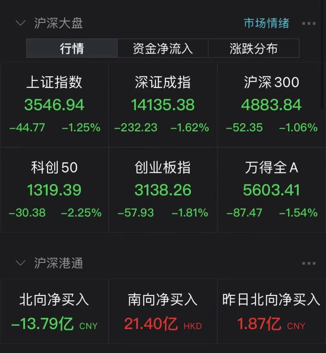 10月12日,A股延续调整格局,三大股指盘中均跌超2%。截至收盘,上证指数跌1.25%,报3546.94点;深证成指跌1.62%,报14135.38点;创业板指跌1.81%,报3138.26点。