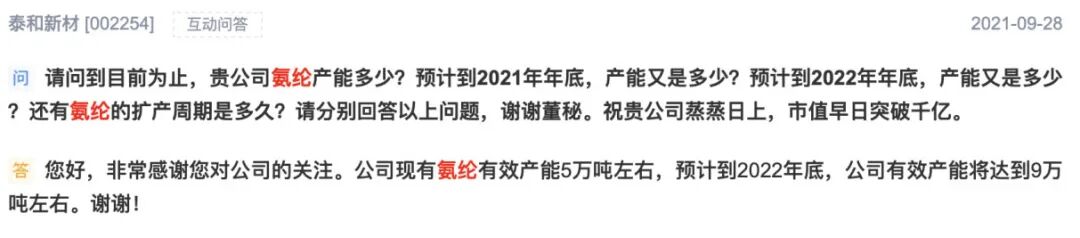 近日,泰和新材在投资者互动平台表示,公司现有氨纶有效产能5万吨左右,预计到2022年底,公司有效产能将达到9万吨左右。