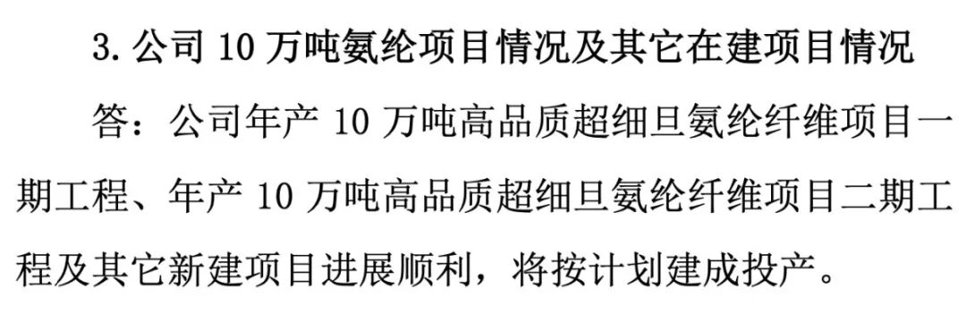 新乡化纤具备有氨纶产能10万吨/年,位居国内前三。近期,公司在接待机构投资者调研时表示,相关工程进展顺利,将按计划建成投产。