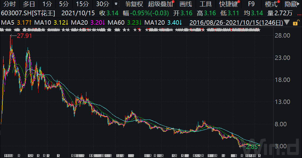Wind数据显示,截至10月15日收盘,ST花王股价自高位下跌近90%。