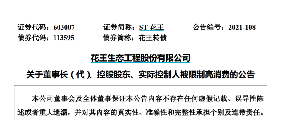 ST花王10月15日晚公告称,公司当日收到公司董事长(代)肖姣君、公司实际控制人肖国强转发的张家港市人民法院出具的《执行通知书》和《限制消费令》,获知两人及公司控股股东花王集团被申请强制执行,被限制高消费。