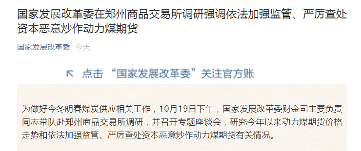 当日,国家发改委财金司主要负责人带队赴郑州商品交易所调研,并召开专题座谈会,研究今年以来动力煤期货价格走势和依法加强监管、严厉查处资本恶意炒作动力煤期货有关情况。