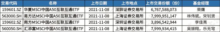 11月8日,华夏、易方达、南方、汇添富旗下4只MSCI中国A50互联互通ETF(以下简称:A50ETF)分别在沪深交易所上市。作为年末最重磅的基金产品,该批A50ETF从获批、发行到上市均受到市场的高度关注,上市首日表现更是“吸睛”又“吸金”。