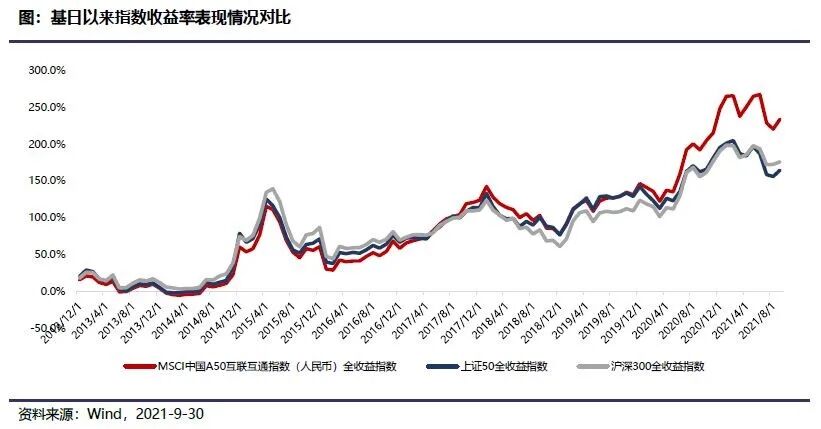 从历史表现来看,MSCI中国A50互联互通指数自基日(2012年11月30日)以来至2021年9月30日,累计涨幅达233.47%,明显优于同期上证50(164.27%)和沪深300指数(175.69%)的表现,在近一年、两年、三年、五年维度中的收益率均长期占优。