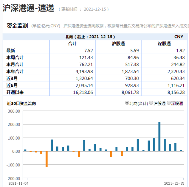 Wind数据显示,截至15日收盘,沪股通、深股通全天分别净流入5.59亿元、1.92亿元,合计7.52亿元。12月1日至今,北向资金已连续11个交易日净流入。