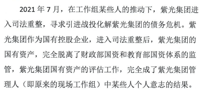 健坤投资在声明中表示,紫光集团进入司法重整后,紫光集团的国有资产完全脱离了财政部国资系统和教育部国资系统的监管,紫光集团国有资产的评估工作,完全成了紫光集团管理人(即现场工作组)中某些个人意志的结果。