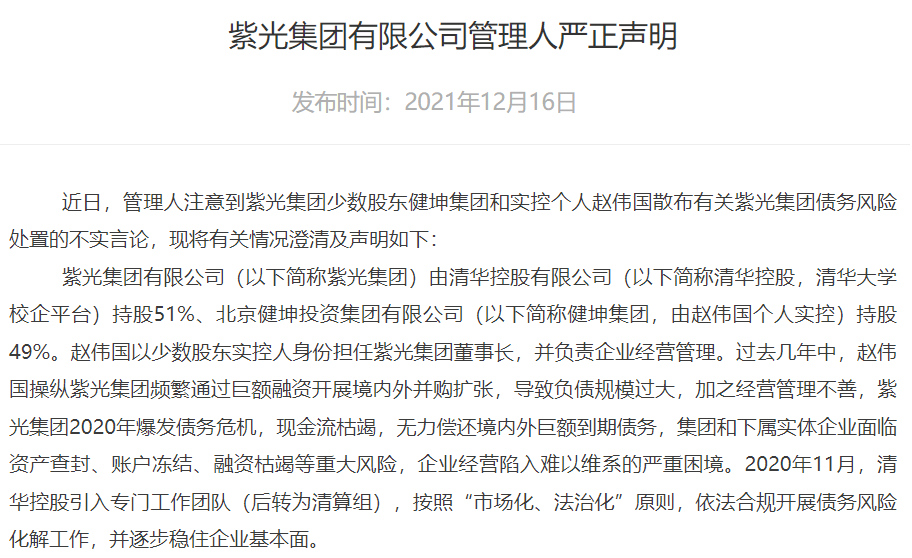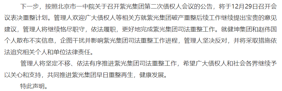 紫光集团管理人表示,就健坤集团和赵伟国个人散布不实信息,企图干扰并影响紫光集团司法重整工作进程,管理人坚决反对,并将采取措施依法追究相关个人和单位法律责任。