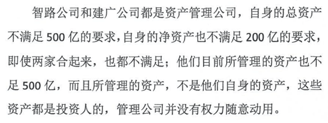 健坤投资认为,智路公司和建广公司都是资产管理公司,自身总资产和净资产均不满足相关要求,即便两家合起来,也不能满足。
