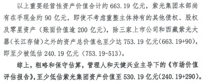 健坤投资认为,管理人和天健兴业至少低估紫光集团重整主体所持长江存储权益价值290亿元、低估除三家上市公司和长江存储之外的资产总价值240.19亿元。