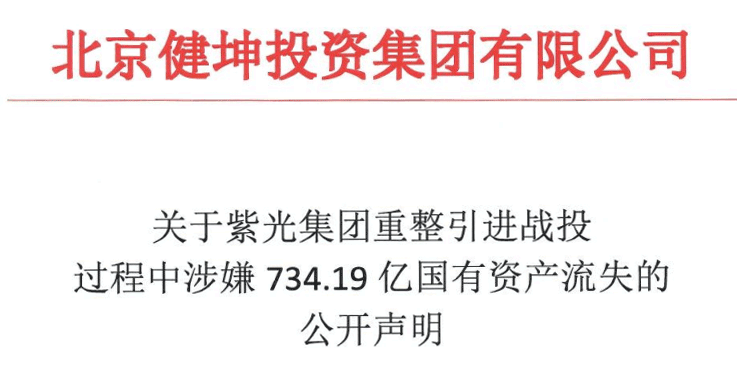 12月15日,一则北京健坤投资集团有限公司(简称“健坤集团”)的公开声明在网络流传,健坤集团在声明中表示,紫光集团重整引进战投事宜涉嫌734.19亿国有资产流失。
