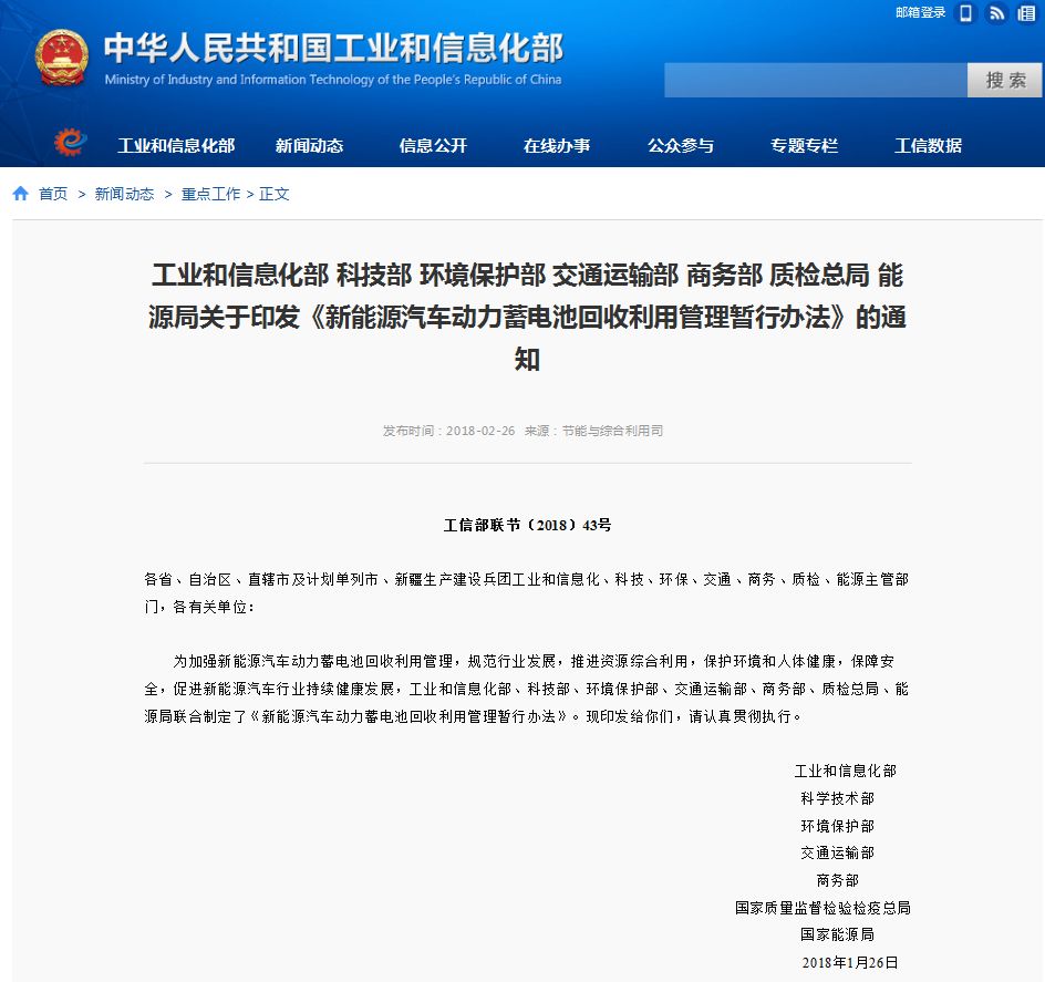 根据数据显示,1-4月,新能源汽车产销分别完成23.2万和22.5万辆,同比分别增长142.4%和149.2%。今年1月26日,工信部、科技部、环境保护部、交通运输部、商务部、质检总局、能源局联合印发的《新能源汽车动力蓄电池回收利用管理暂行办法》中提出,强调落实生产者责任延伸制度,要求汽车生产企业承担动力蓄电池回收的主体责任。该办法将于今年8月1日起施行,汽车生产企业承担动力蓄电池回收的主体责任。面对即将实施的管理暂行办法,各车企应开始积极着手布局电池回收业务。