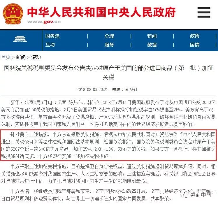 2018年7月11日美国政府发布了对从中国进口的约2000亿美元商品加征10%关税的措施。8月2日美国贸易代表声明称拟将加征税率由10%提高至25%。